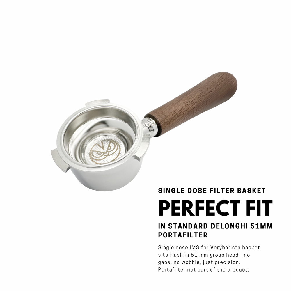 Developed in collaboration with IMS, this precision single filter basket is engineered specifically for DeLonghi espresso machines with 51 mm group head portafilters for single espresso doses of 8-13 g. The basket features a narrow base that directs water flow toward the center of the puck. This geometry enhances extraction, improves crema formation, and supports efficient puck drying and clean ejection.